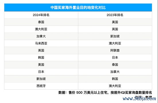 根据该报告分析的2024年相关数据:在吸引中国人购买住宅(价格在500万美元或以上的超豪华房屋)的国家中,美国从第一位跌至第七位,英国从第二位下滑到第五位,新加坡从第三位降至第九位;与此同时,泰国从第七位跃升至第一位,澳大利亚从第四位升至第二位,加拿大从第八位跃升至第三位。