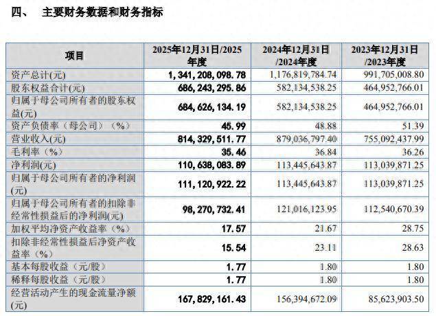 2023年及2024年,恒兴股份分别实现营收7.55亿元及8.79亿元,归母净利润分别为1.13亿元及1.13亿元,扣非净利润分别为1.13亿元及1.21亿元。2025年,公司实现营业收入8.14亿元,同比下降7.36%;归母净利润1.11亿元,同比下降2.05%;扣非净利润9,827.07万元,同比下降18.80%。
