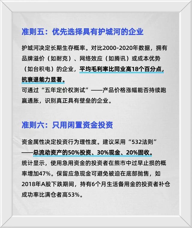 - 分析企业的财务报表,寻找具有高毛利率、高市场份额、低负债等特征的企业。同时,关注企业的创新能力和品牌建设情况,判断其护城河的宽度和深度。