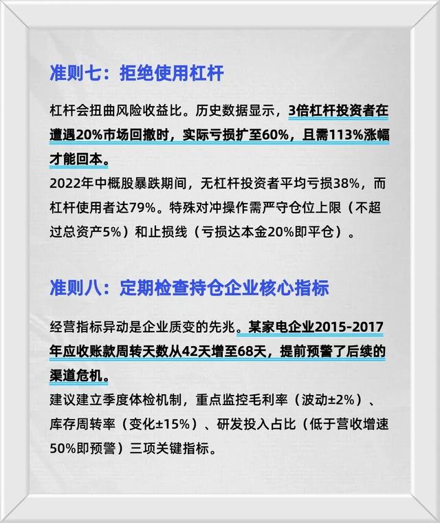 - 投资者要坚守不使用杠杆的原则,无论是场内融资还是场外配资等形式的杠杆都要远离。在评估投资收益时,要以自有资金为基础进行计算。